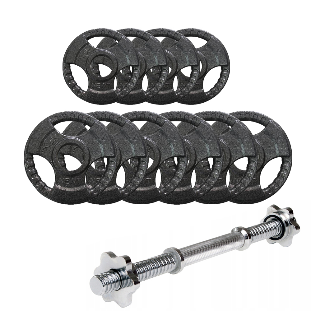 Комплектація: 1 гриф довжиною 40 см, 2 гайки; 6 дисків по 2,5 кг, 4 диски по 1.25 кг.