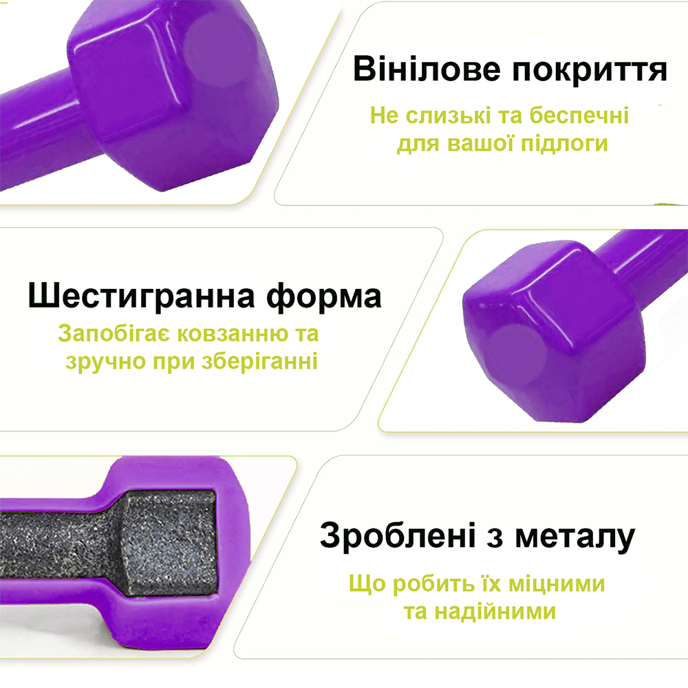 Гантелі зроблені з металу, вкритого вінілом, що робить їх ще більш компактними і надійними