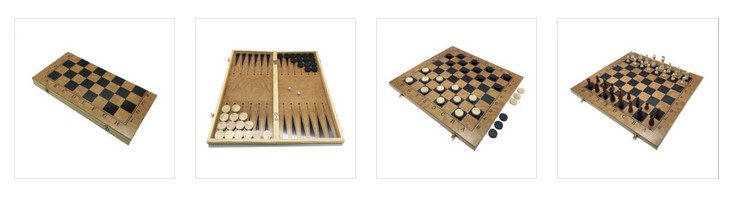 Комплектація: шахівниця, фішки для шашок і нард, фігури для шахів, кубики (кістки)
