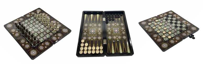 Комплектація: шахівниця, фішки для шашок і нард, фігури для шахів, кубики (кістки)