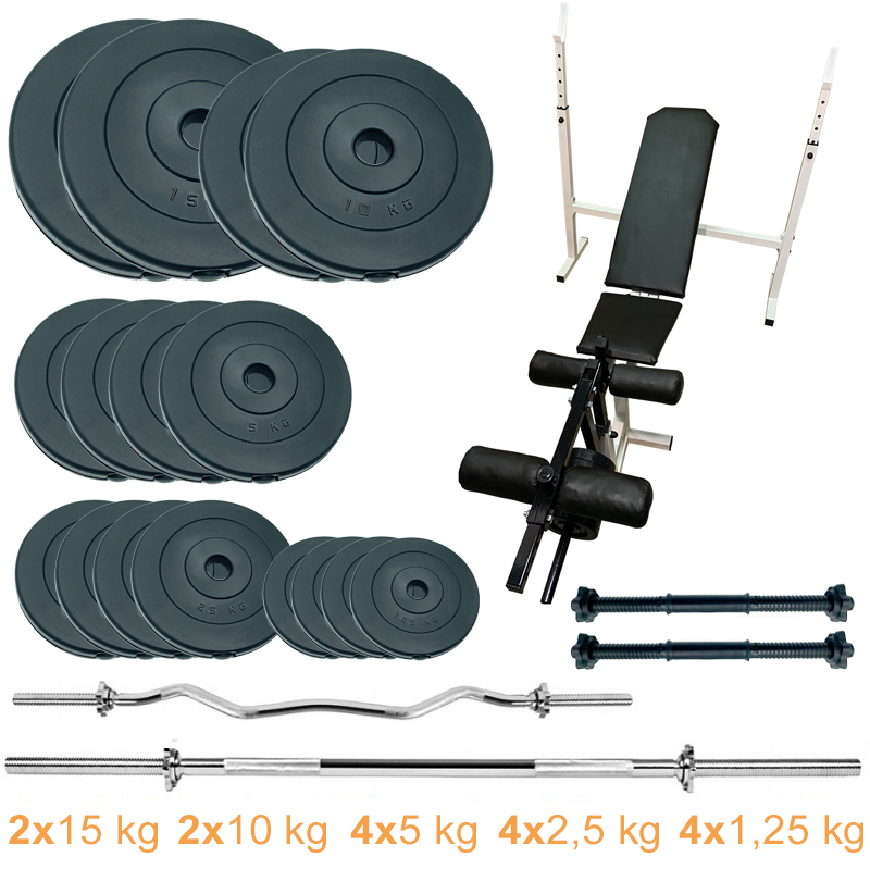 Лава для жиму з набором штанг і гантелей Newt ProGym Scott Plus Set Pro 100 kg – універсальний силовий набір який підійде як новачкові, так і професіоналам. До складу набору входять різні грифи (W- образний гриф, прямий гриф і гантельние грифи) і різні диски, завдяки чому Ваші тренування стануть ще ефективніше! Збирайте гантелі або штангу зі зручною для вас вагою! Диски в наборі йдуть повністю металеві робить набір компактним в порівнянні з композитними аналогами. Грифи виготовлені з якісних матеріалів, оснащені гайками “Вейдера”, для швидкої і безпечної фіксації млинців на грифі.