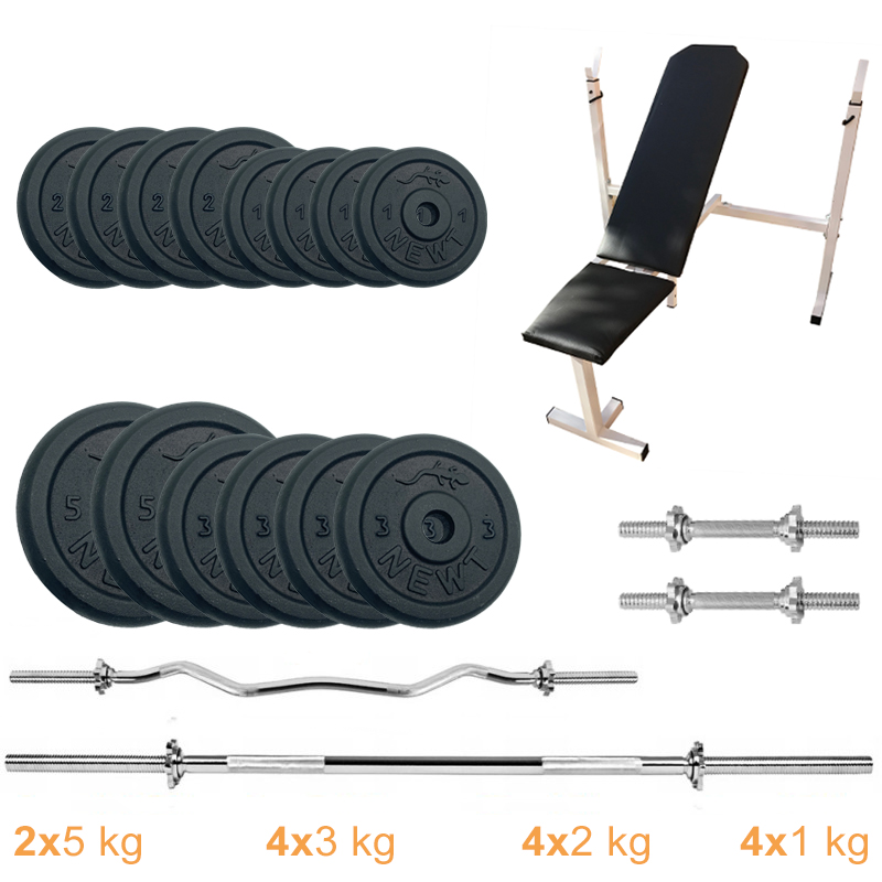 Лавка для жиму з набором штанга + гантелі металеві Newt Gym Set-SKH Home 50 кг – універсальний силовий набір який підійде як новачкові, так і професіоналам. До складу набору входять лавка для жиму зі стійками, різноманітні грифи (W-подібний гриф, прямий гриф та гантельні грифи) та різноманітні диски, завдяки чому Ваші тренування стануть ще ефективнішими! Збирайте гантелі чи штангу зі зручною для вас вагою! Диски в наборі йдуть повністю металеві, що робить набір компактнішим порівняно з композитними аналогами. Грифи виготовлені з якісних матеріалів, оснащені гайками “Вейдера”, для швидкої та безпечної фіксації млинців на грифі.