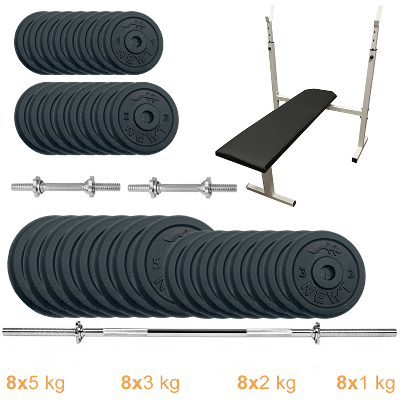 Лавка для жиму горизонтальна з набором штанга + гантелі металеві Newt Stadard Set-STHW Home 95 кг – універсальний силовий набір який підійде як новачкові, так і професіоналам. До складу набору входять лавка для жиму зі стійками, різні грифи (прямий гриф та гантельні грифи) і різні диски, завдяки чому Ваші тренування стануть ще ефективніші! Збирайте гантелі або штангу із зручною для вас вагою! Диски в наборі йдуть повністю металеві, що робить набір компактнішим в порівнянні з композитними аналогами. Грифи виготовлені з якісних матеріалів, оснащені гайками “Вейдера”, для швидкої і безпечної фіксації млинців на грифах.