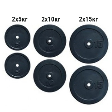 Комплектація: 15 кг – 2 шт., 10 кг – 2 шт., 5 кг – 2 шт. Загальна вага набору 60 кг.
