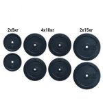 Комплектація: 15 кг – 2 шт., 10 кг – 4 шт., 5 кг – 2 шт. Загальна вага набору 80 кг.