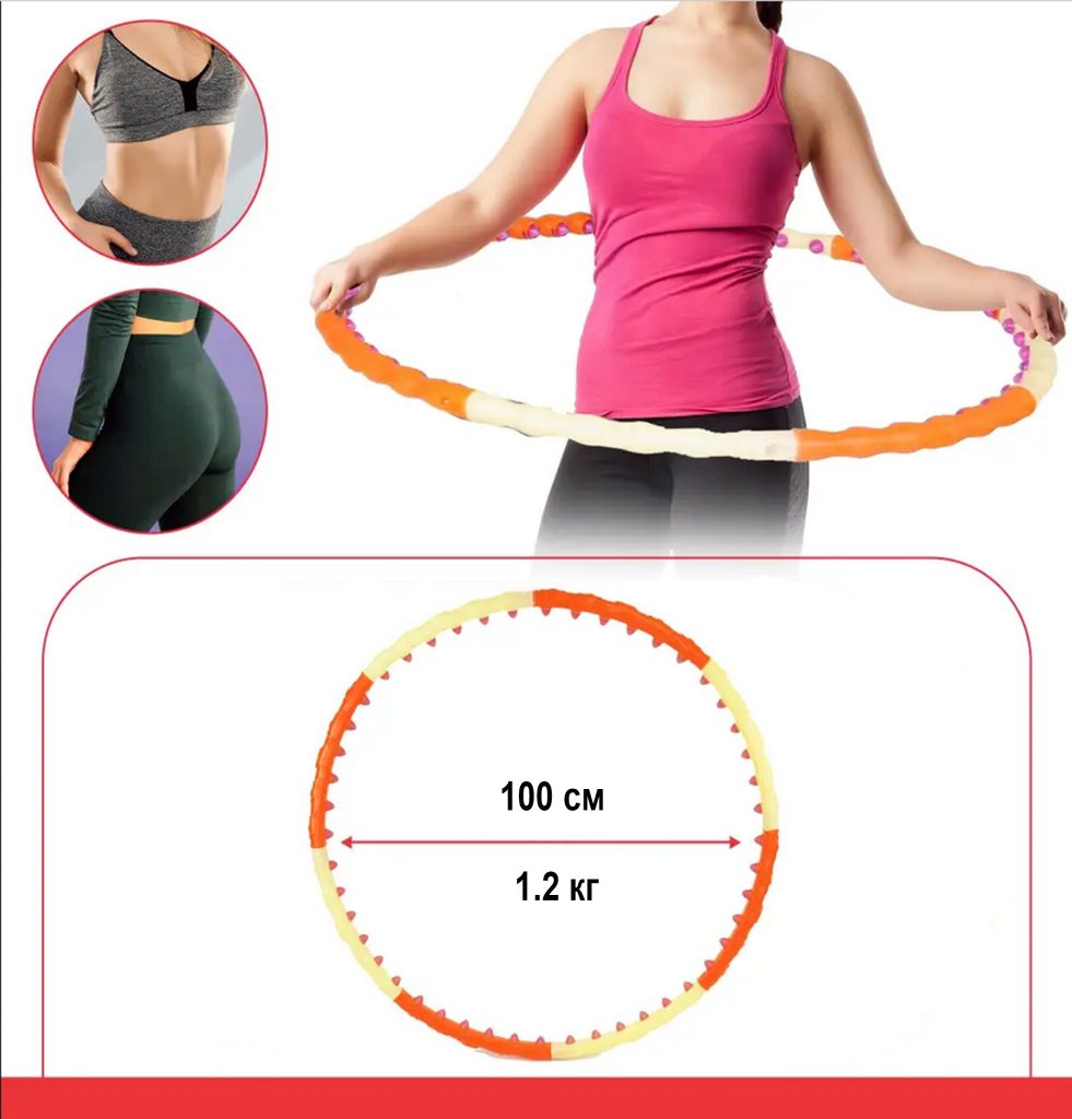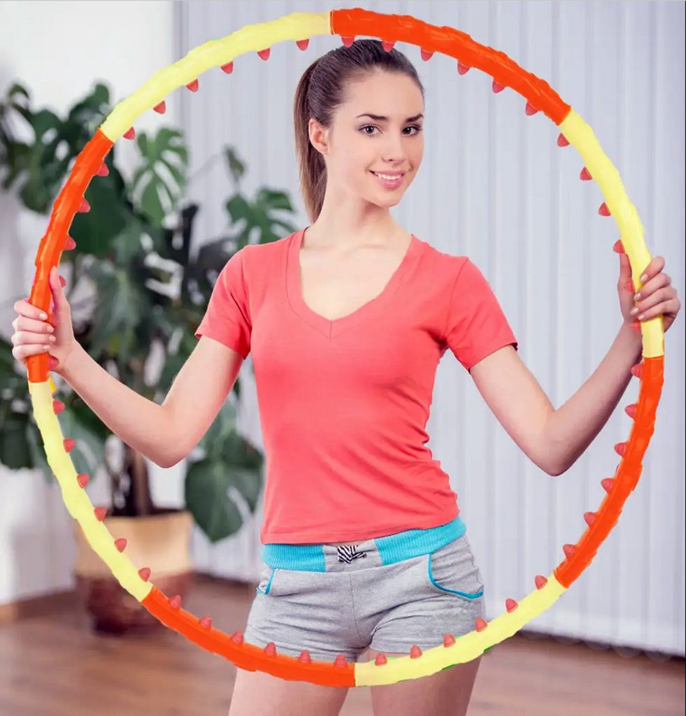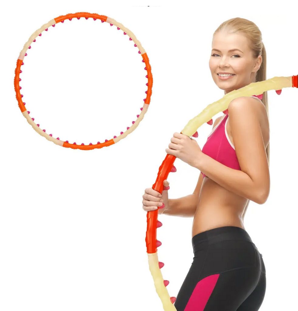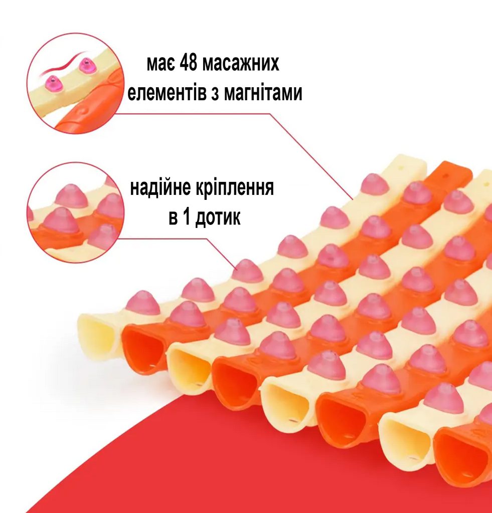 Обруч складається з 8 частин, які легко збираються одним дотиком, що робить його зручним для зберігання та транспортування. Вбудовані 48 магнітів забезпечують додатковий масажний ефект, стимулюючи кровообіг та покращуючи загальне самопочуття.