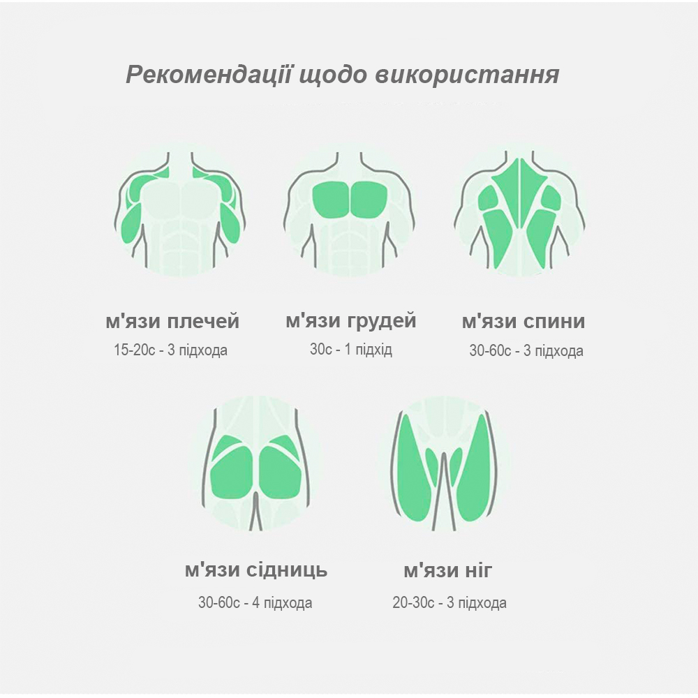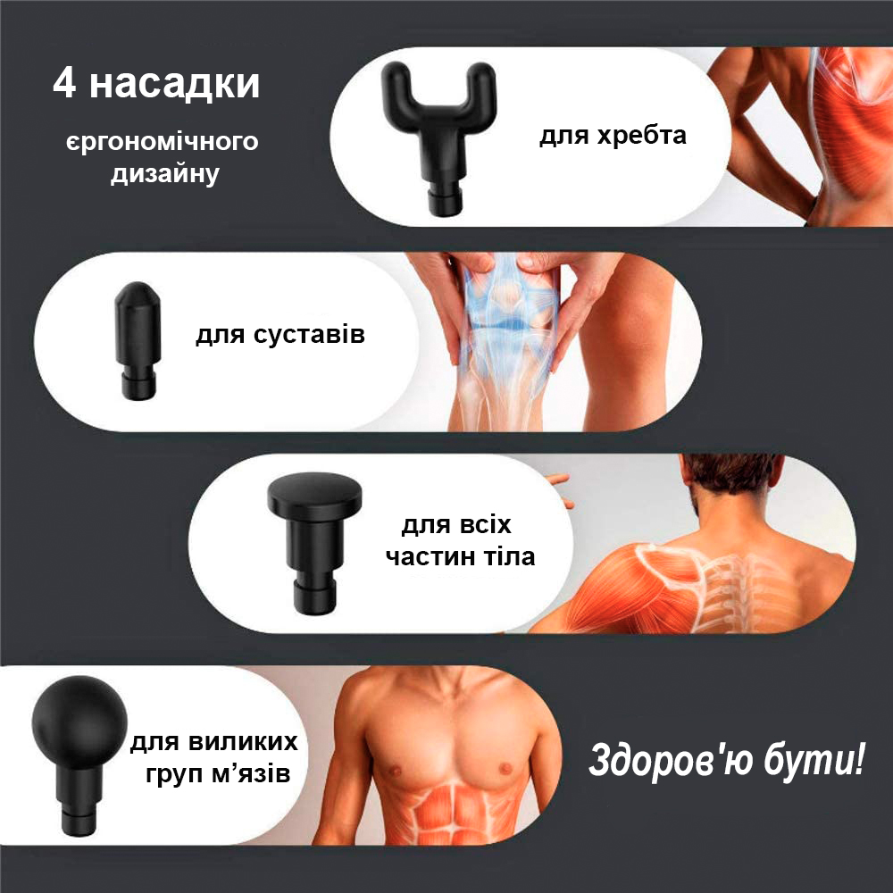 Ця модель поставляється з 4 різними насадками для цілеспрямованого впливу на кожну групу м’язів.