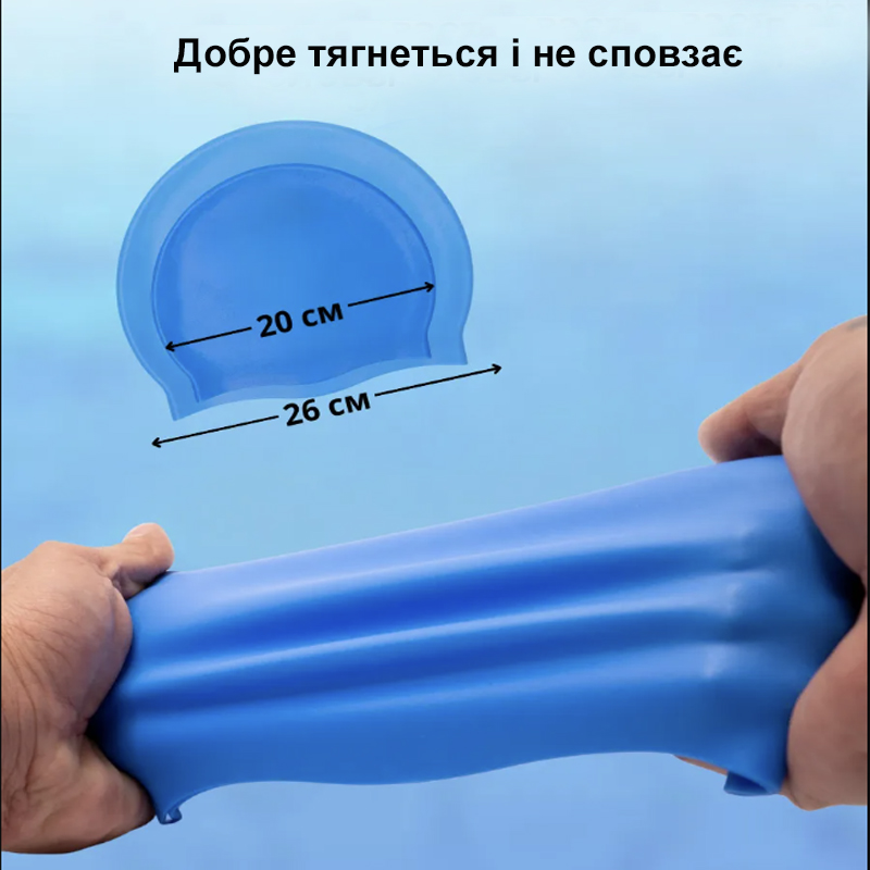 Шапочка добре тягнеться, що забезпечує комфортне і точне прилягання до голови, мінімізуючи можливість протікання води під час плавання.