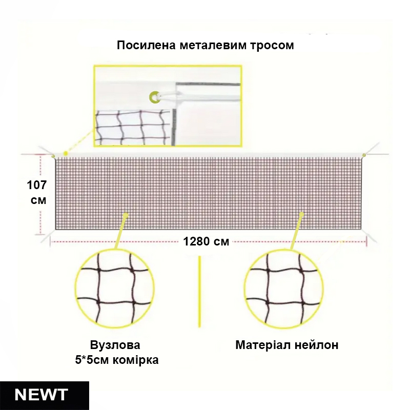Ця сітка ідеально підходить як для тренувань, так і для професійних матчів, забезпечуючи надійність і високу якість гри.