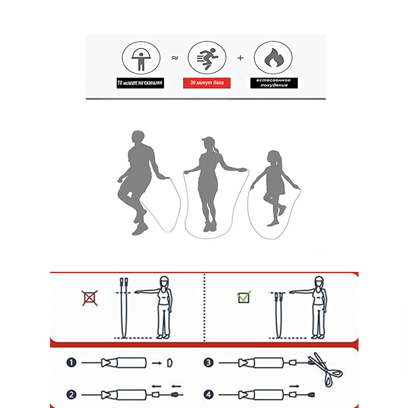 В ручки вмонтовані підшипники, а також неопренові вставки, завдяки чому скакалка дуже зручно сидить в руках.