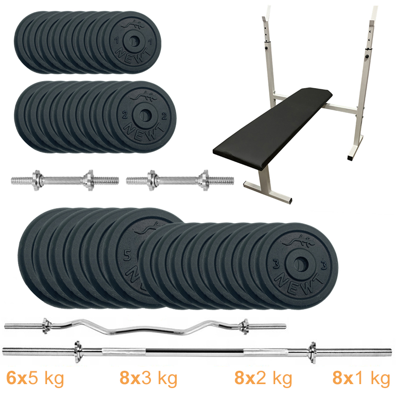 Лавка для жиму горизонтальна з набором штанга + гантелі металеві Newt Stadard Set-STHW Home 94 кг — універсальний силовий набір який підійде як новачкові, так і професіоналам. До складу набору входять лавка для жиму зі стійками, різні грифи (W- образний гриф, прямий гриф та гантельні грифи) і різні диски, завдяки чому Ваші тренування стануть ще ефективніші! Збирайте гантелі або штангу із зручною для вас вагою! Диски в наборі йдуть повністю металеві, що робить набір компактнішим в порівнянні з композитними аналогами. Грифи виготовлені з якісних матеріалів, оснащені гайками «Вейдера», для швидкої і безпечної фіксації млинців на грифах.