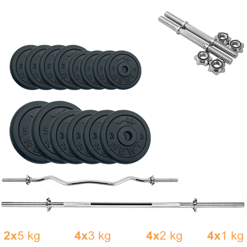 Набір штанга + гантелі металеві Newt Gym Set-HW Home 50 кг — універсальний силовий набір який підійде як новачкові, так і професіоналам. До складу набору входять різні грифи (W- образний гриф, прямий гриф та гантельні грифи) і різні диски, завдяки чому Ваші тренування стануть ще ефективніші! Збирайте гантелі або штангу із зручною для вас вагою! Диски в наборі йдуть повністю металеві, що робить набір компактнішим в порівнянні з композитними аналогами. Грифи виготовлені з якісних матеріалів, оснащені гайками «Вейдера», для швидкої і безпечної фіксації млинців на грифах.