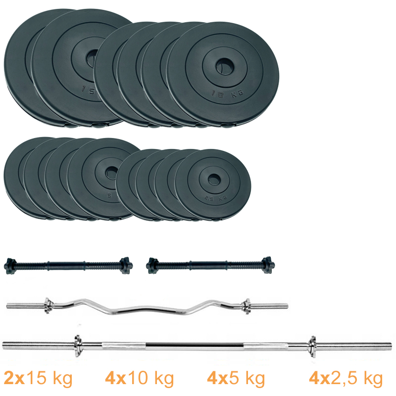 Набор штанга + гантели Newt Gym Set-W Rock Pro 115 кг– универсальный силовой набор который подойдет как новичку, так и профессионалам. В состав набора входят разные грифы (W-образный гриф и гантельные грифы) и разные диски, благодаря чему Ваши тренировки станут еще эффективней! Собирайте гантели или штангу с удобным для вас весом! Диски в наборе покрыты специальным ударопрочным, износостойким пластиком, который обезопасит Ваш пол от царапин и потёртостей. Грифы изготовлены из качественных материалов, оснащены гайками «Вейдера», для быстрой и безопасной фиксации блинов на грифах.
