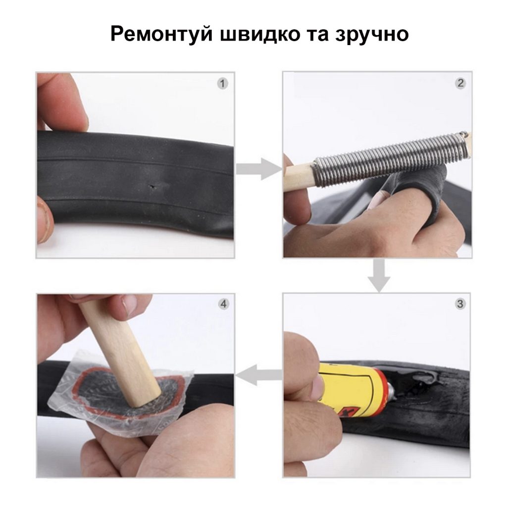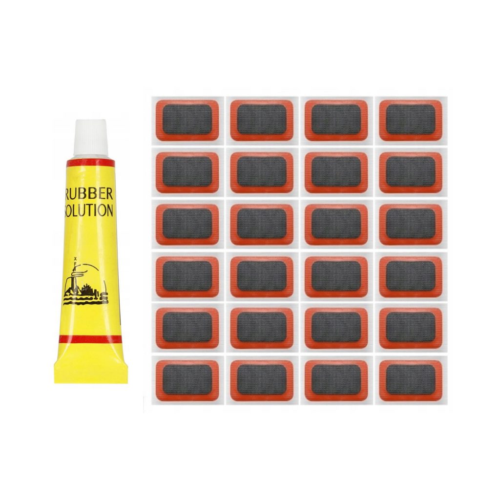 Комплектация: 24 самоклеящиеся латки для ремонта камер, тюбик резинового клея, картонная коробка