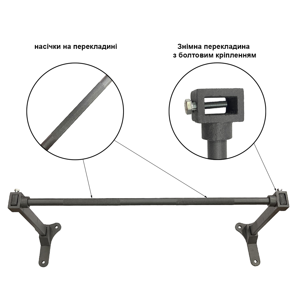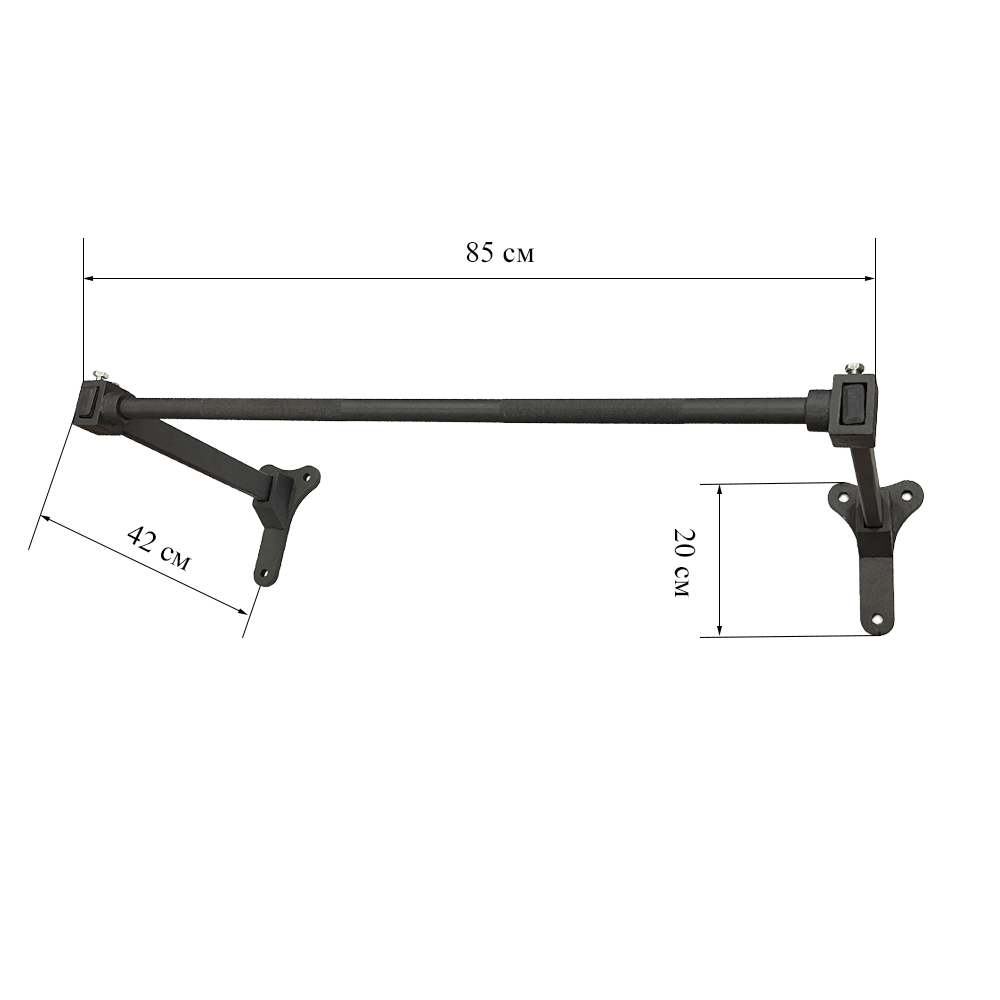 Ширина перекладины – 85 см, вынос от стены – 42 см, высота – 40 см, Диаметр перекладины – 27 мм (стенка 2,5 мм), основание: труба 40*40 толщина стенки 2,5 мм.